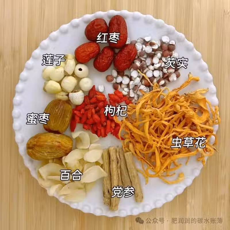 蟲草花15g、芡實5g、百合10g、蓮子10g、黨參10g、紅棗5顆、枸杞5g、蜜棗2顆、烏雞500g