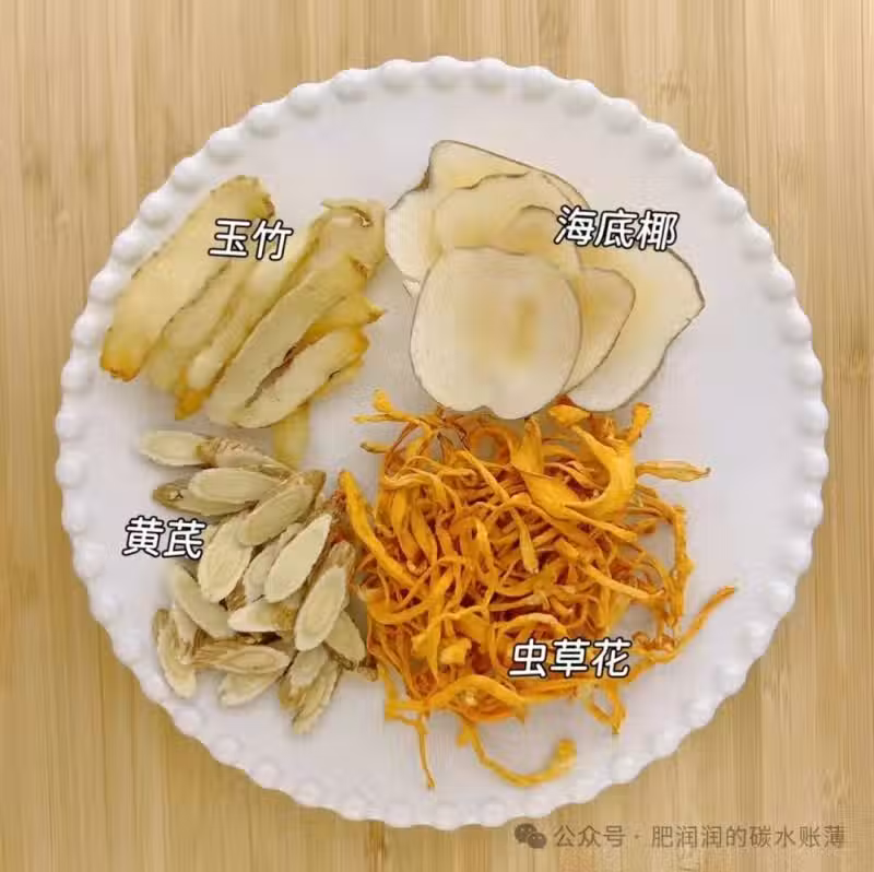 蟲草花15g、玉竹10g、黃芪10g、海底椰5片、排骨400g