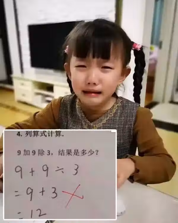 我女兒哪錯了?國小三年級數學題:「9+9÷3=12」被老師打叉!家長質問老師「反被打臉」:好好審題