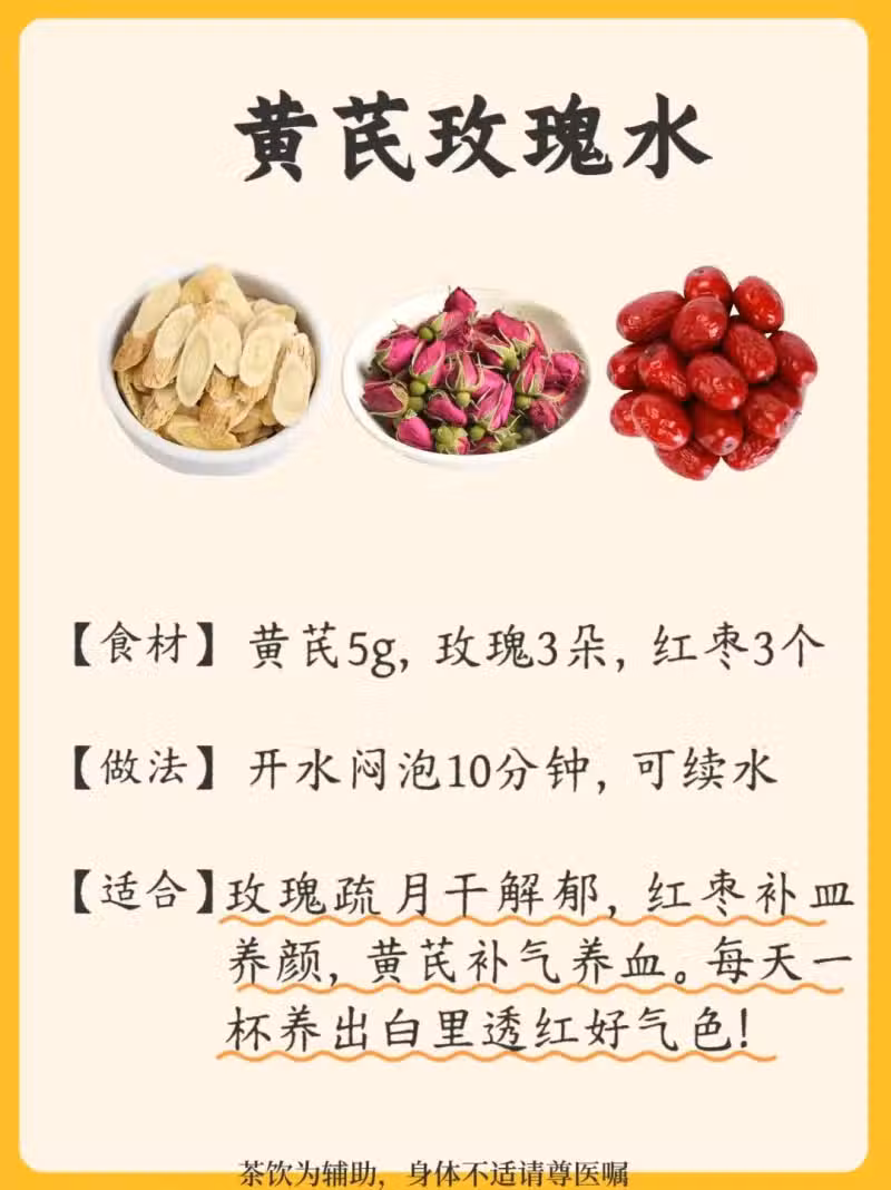 ✔️玫瑰疏肝解郁,紅棗補血養顏,黃芪補氣養血。每天一杯,養出白裡透紅好氣色!