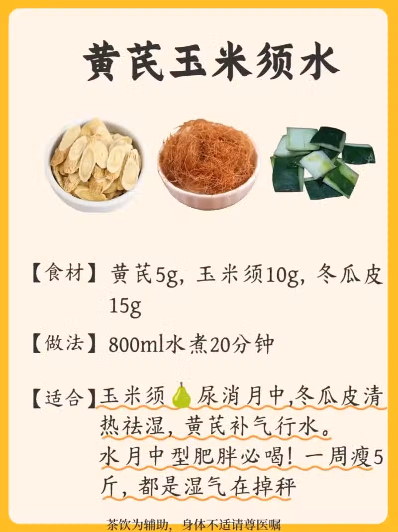 ✔️玉米須利尿消腫,冬瓜皮清熱祛濕,黃芪補氣行水。水腫型肥胖必喝!