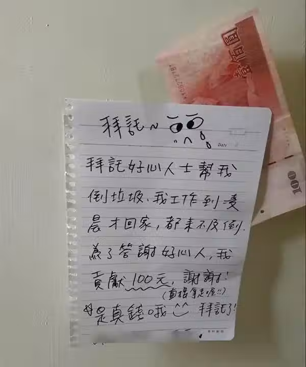 沒時間倒垃圾!她在門口「留紙條+百元鈔」請鄰居幫倒,隔天回家一看愣住了:是我太天真...