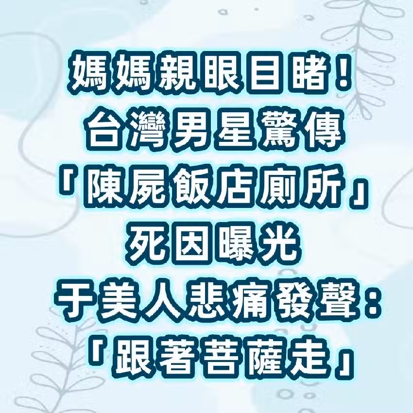 媽媽親眼目睹!台灣男星驚傳「陳屍飯店廁所」死因曝光 于美人悲痛發聲:「跟著菩薩走...」