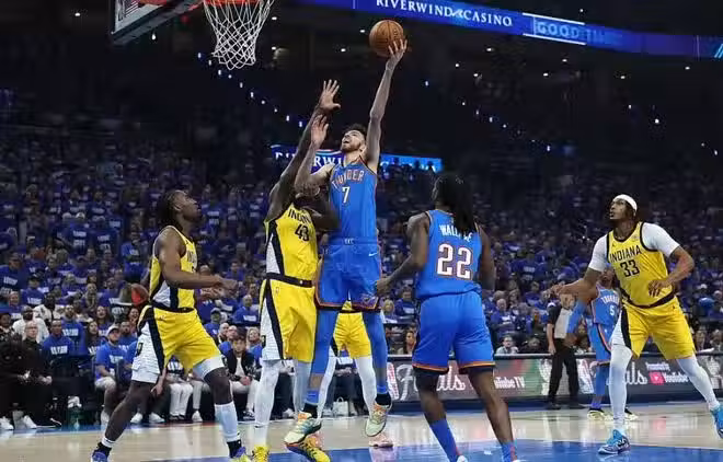 其二、步行者護框在下滑。G1一戰,步行者全場搶下56個籃板,比雷霆多17個。可是本場比賽步行者只有35個籃板,比雷霆少8個。雷霆犧牲了自己攻守轉換的優勢(快攻只拿到4分)讓霍姆格倫和哈滕更多時間搭檔在一起守護籃下,效果明顯更好。步行者衝擊籃筐的人員很多,但是他們失誤同樣不少,當然,關於籃下對抗的尺度問題,其實會直接決定系列賽的走勢,打到這個階段,任何球隊只要露出一點小破綻,對方都能抓住機會取得勝利。這裡引申出第三點,裁判的吹罰。