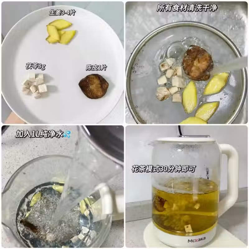 超簡單!把陳皮、生薑片、茯苓洗凈,一起放進養生壺裡,加入足量清水,煮個10到30分鐘就可以了。煮好後趁溫熱喝。