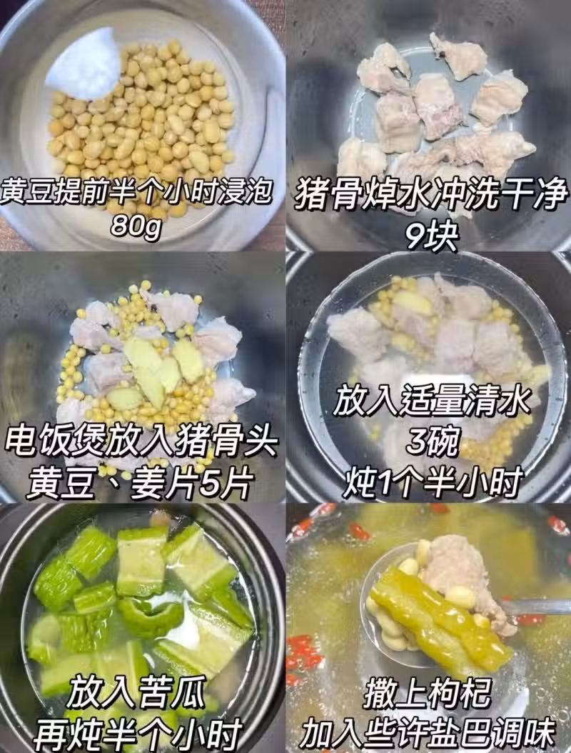 黃豆80g、苦瓜一根、排骨500g、蔥姜、適量枸杞