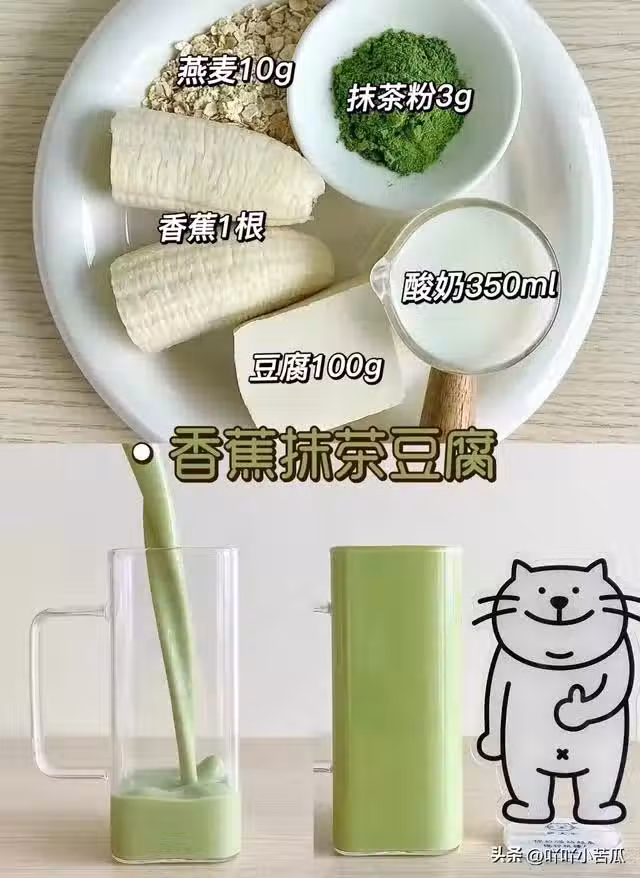 食材:嫩豆腐100g+抹茶粉3g+酸奶350ml+燕麥10g+香蕉1根。