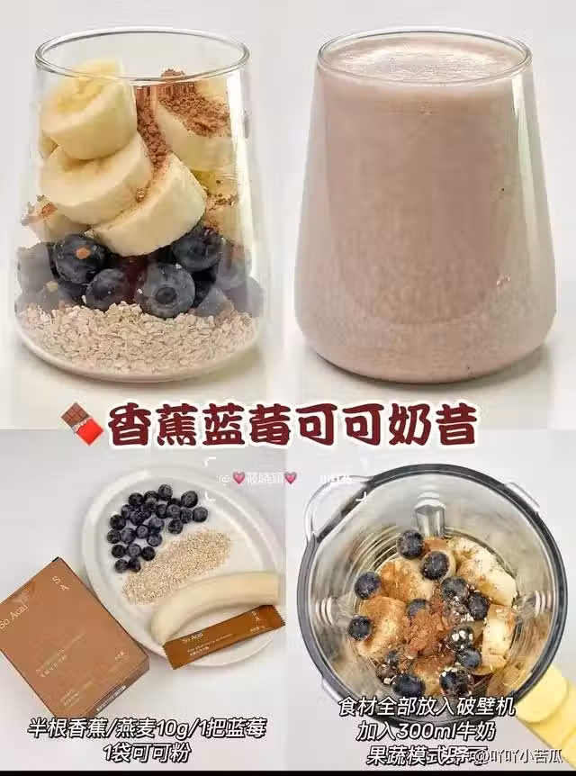 食材:藍莓15顆+香蕉1根+燕麥2勺+可可粉5g+200ml牛奶。