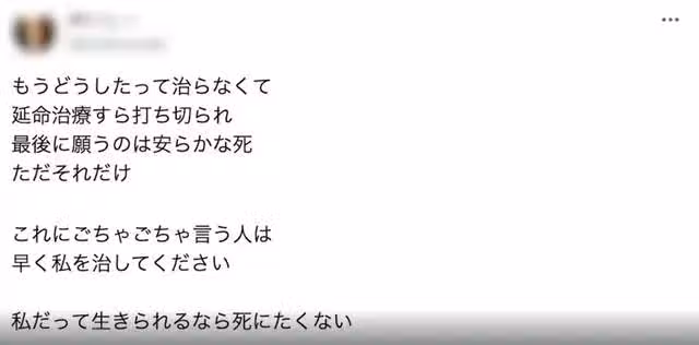 「已經無論如何都治不好了,就連延命治療也被中斷。最後只希望能平靜地死去,僅此而已。對這種情況諸多非議的人,請快點把我治好啊。如果能活下去,我又怎麼會.求..死.。」