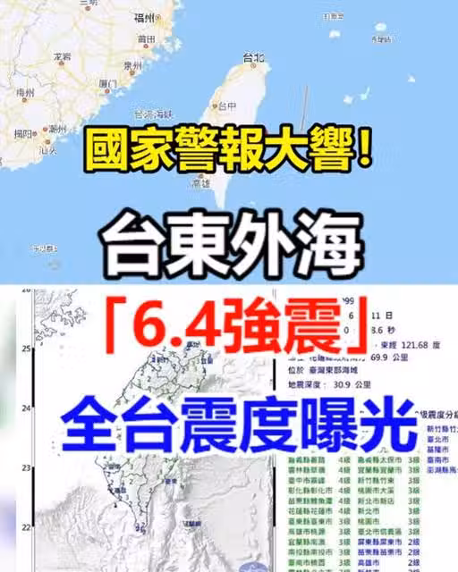 國家警報大響!台東外海19:00「6.4強震」 全台震度曝光