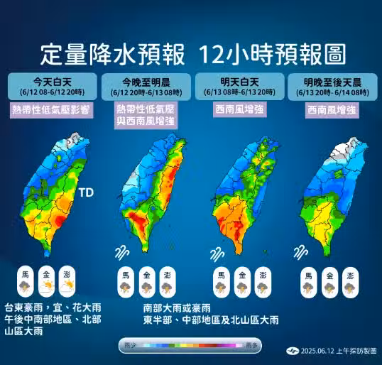 受到熱帶性低氣壓及西南風的雙重影響,從今天起至周六清晨,東半部及南部地區都需要特別留意強降雨。