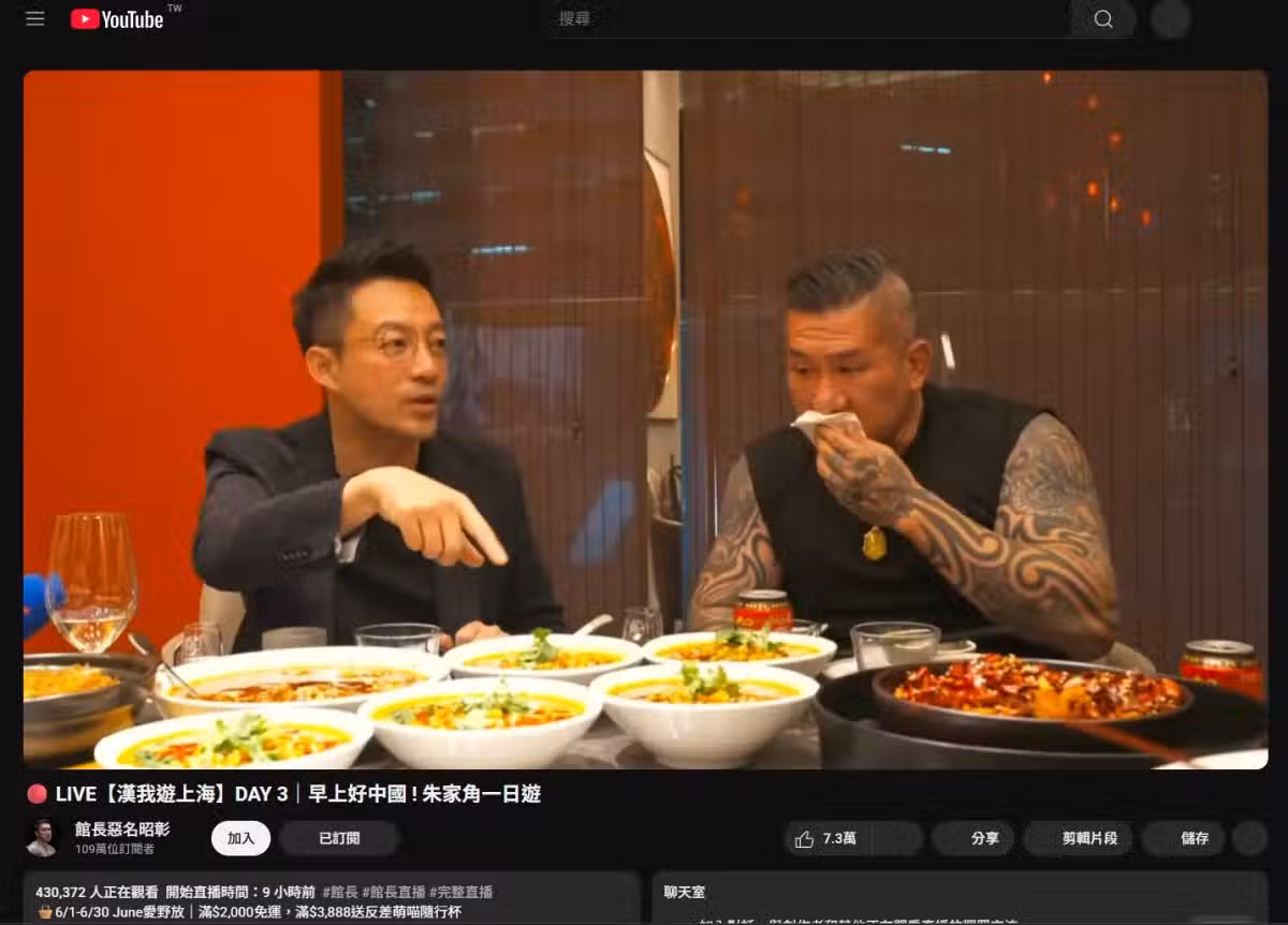 網紅「館長」陳之漢於12日晚間在上海新天地的「麻六記」火鍋店與汪小菲共進晚餐,透過YouTube直播吸引超過43萬人同時在線觀看,刷新台灣YouTube直播同時在線人數歷史紀錄。