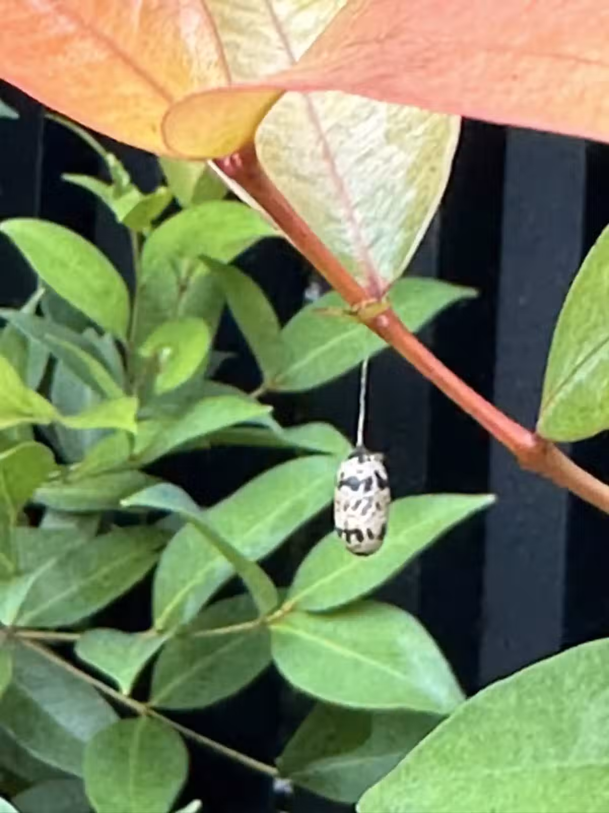 讓他不知所措。這位園藝愛好者擔心地詢問是否該移除這個不明物體,沒想到植物高手們看到後都欣喜若狂。原來這個美麗的黑白小掛飾是「懸繭姬蜂」的傑作,不但不該移除,反而是值得慶幸的好事。