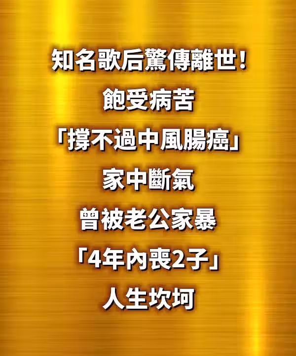 知名歌后驚傳離世!飽受病苦「撐不過中風腸癌」家中斷氣 曾被老公家暴「4年內喪2子...」人生坎坷