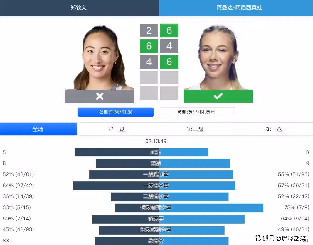 還有,可以通過數據統計找到鄭欽文輸球的原因,包括全場出現8個雙誤,一發得分率64%,但二發得分率只有36%,還有破發點轉化率僅為33%,關鍵分的把握不如阿尼西莫娃做得好。