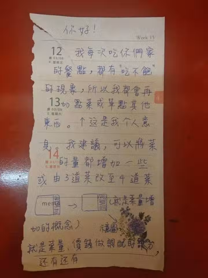 我建議,把菜的量增加到普通量的三倍,或者由三道菜改成四道菜!」甚至還附上了示意圖,詳細說明該如何改進,真是有理有據,讓老闆感到既無奈又氣憤。