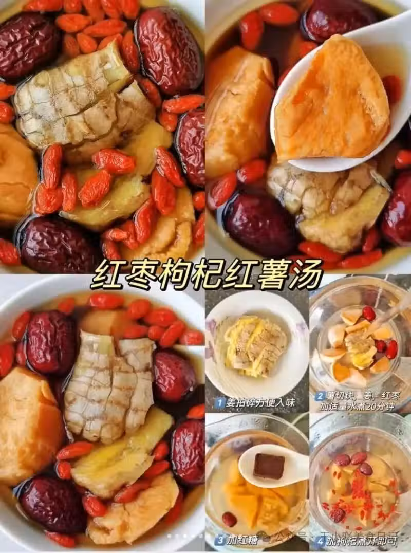 紅薯 1 個、姜 1 塊、紅棗 5 顆、枸杞 10 顆、紅糖適量