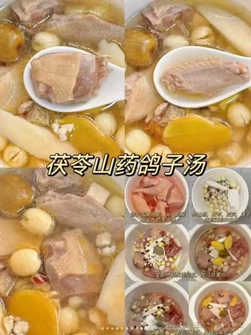 食材處理:鴿子去掉內臟、頭和屁股,用鹽水抓洗乾淨。懷山藥洗凈去皮,切成段。茯苓、芡實、蓮子提前用清水浸泡 20 分鐘。