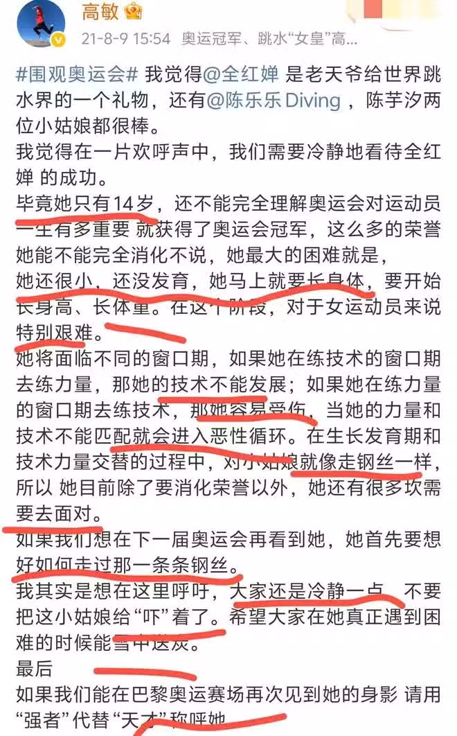 高敏,作為一帶跳水女皇,早就看到了全紅嬋會面臨的問題,長身高,長體重,發育,長身體,技術和力量如何能達到平衡,這些問題在14歲的全紅嬋身上還看不出來,可是17歲的全紅嬋卻正在經歷,也在努力克服,調整