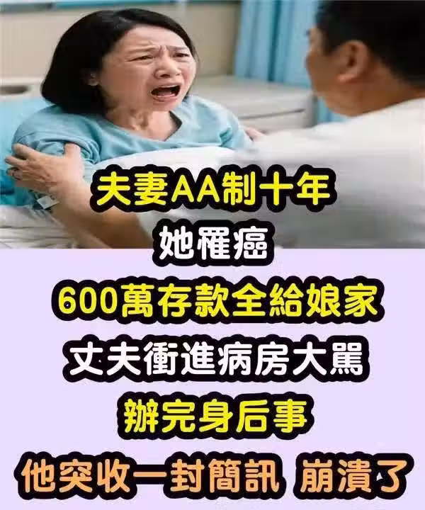 夫妻AA制十年!她罹癌「600萬存款全給娘家」丈夫衝進病房大罵 辦完身後事「他突收一封簡訊」崩潰了