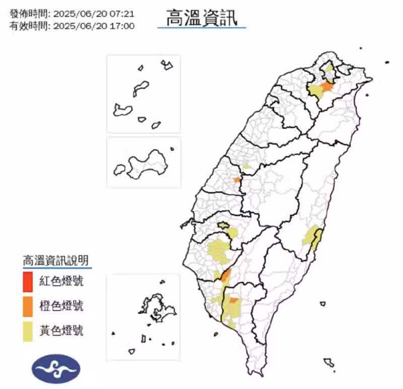 今天 (20) 白天晴朗炎熱,氣象署提醒:「新北市、彰化縣、高雄市、屏東縣為橙色燈號,有連續出現36度高溫的機率,請加強注意。