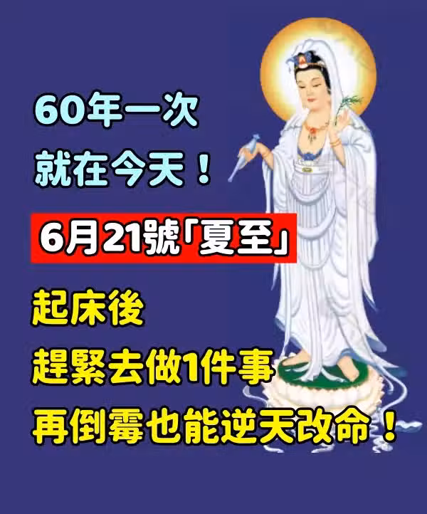 📅 60年一次,就在今天!6月21日「夏至」來臨!這可是60年才出現一次的「黃道吉日」,千萬不能錯過!尤其在夏至這天,陰陽轉換、天地交匯,是一年當中陽氣最盛的時刻,如果你想轉運、想擺脫厄運、想讓財運、桃花、人緣通通旺起來,一定要「起床後立刻去做這件事」!