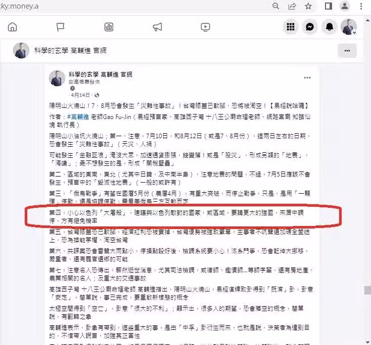 包括俄烏5月在土耳其展開和談、台灣經濟紅利恐被耗盡、共諜案可能雷聲大雨點小,以及檢察官罷官還鄉等情況。特別值得注意的是,他當時特別提醒要「小心以色列大屠殺」,並建議與以色列有衝突的國家應尋求強國居中調停。沒想到6月13日,以色列果真對伊朗發動突襲,再次印證他的預言。