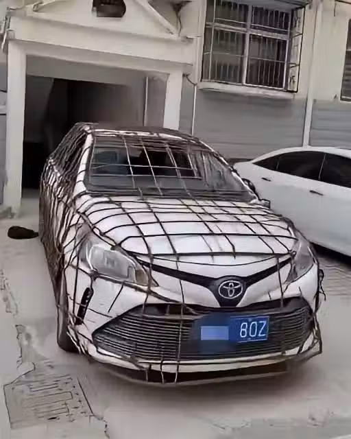視訊中,一輛停靠在單元門口的白色豐田車遭遇了獨特的"法治制裁"——被鋼筋焊接得密不透風。