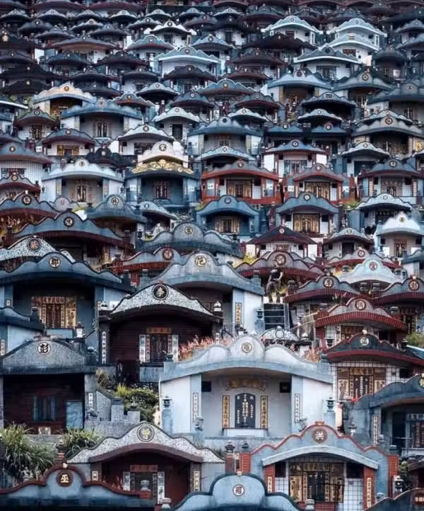 照片中的墓園規模宏大,層層疊疊的墓碑與墓室排列得極為緊湊,灰紅相間的屋頂、金色的裝飾文字,以及波浪形的東亞風格建築,構成了一幅既壯觀又肅穆的畫面。