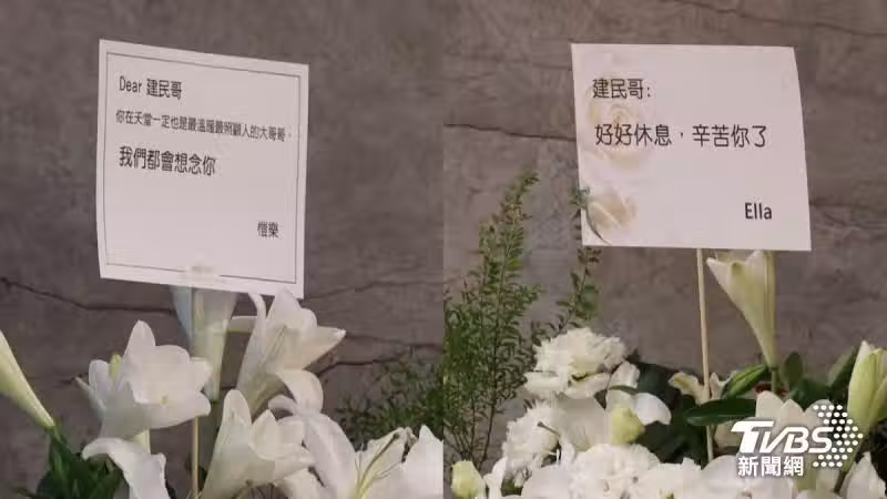 愷樂在花籃上對汪建民表達感謝,「Dear建民哥,你在天堂一定也是最溫暖最照顧人的大哥哥,我們都會想你。愷樂。」Ella則表示:「好好休息,辛苦你了。」