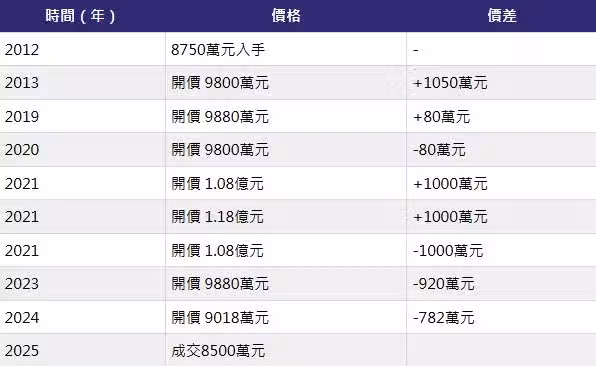七期資深房仲廖香婷表示,由於該戶知名度過高,反而讓許多富豪買家卻步。雖然帳面上僅賠250萬元,但若計入12年持有期間的相關成本,實際損失估計超過800萬元。新屋主以相當於10年前的價格購入,且為全額自備款交易,顯示其充沛的財力。