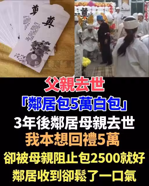 父親去世「鄰居包5萬白包」!3年後鄰居母親去世,我本想回禮5萬,卻被母親阻止「包2500就好」鄰居收到卻鬆了一口氣...