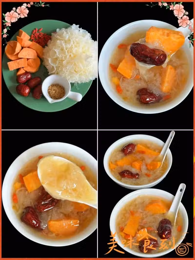 1. 銀耳提前泡1小時,撕成小朵,放入鍋中加溫水,大火煮開後轉小火慢煮40分鐘(中途用湯勺輕輕攪拌,幫助銀耳出膠)