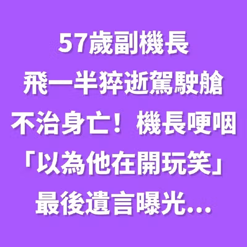 上一秒還好好的有說有笑,下一秒卻天人永隔!日前驚傳一名副機師在飛行途中命喪駕駛艙,機長回憶過程仍不敢置信,兩個人當時才剛正常交談完,對方突歪頭靠在椅子上,當時以為他在開玩笑假裝小睡,降落後才知人已經走了......