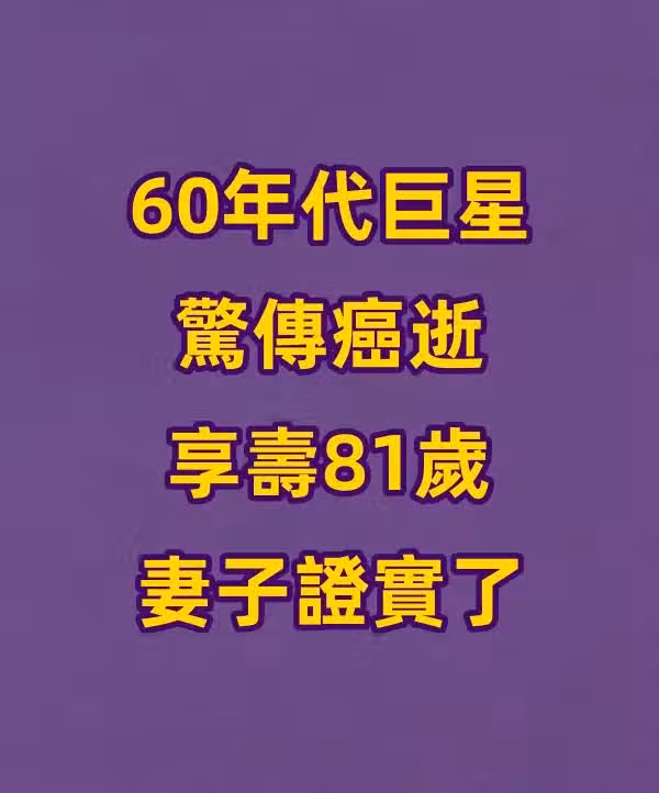 快訊/60年代巨星驚傳癌逝,享壽81歲 妻子證實了