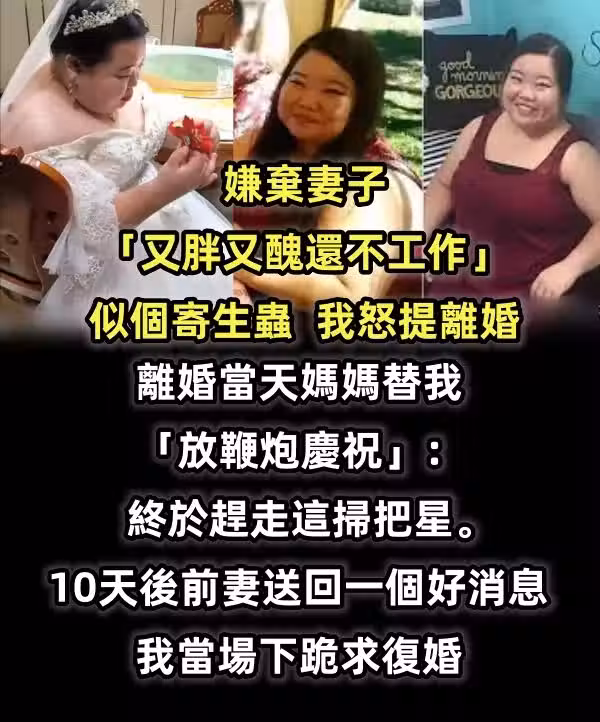 嫌棄妻子「又胖又丑還不工作」似個寄生蟲,我怒提離婚,離婚當天媽媽替我「放鞭炮慶祝」:終於趕走了這個掃把星。10天後前妻送回一個好消息,我當場下跪求復婚...