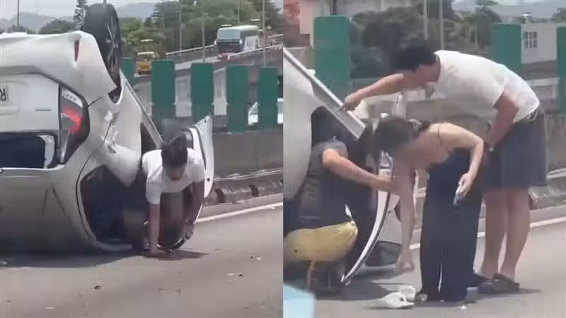 國道翻車180度!低胸妹「燦笑爬出」光腳路上跳 網封:樂天女孩