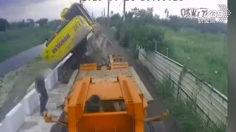 怪手墜落河堤,待救期間死者是怎麼過的?現在長達3分鐘的驚悚影片曝光,只見59歲林男試圖駛離在拖板車上的怪手,但怎麼喬就是卡卡的,他多次探頭確認位置,並前後調整,豈料一瞬間怪手鐵履帶出軌重心不穩,林男被后座力甩回駕駛座,接著整部怪手翻覆墜落河堤,揚起一陣土塵;令人疑惑的是,一旁站著拖板車司機目睹全程,卻在意外發生後愣在原地30秒才轉頭疑似向外求援。