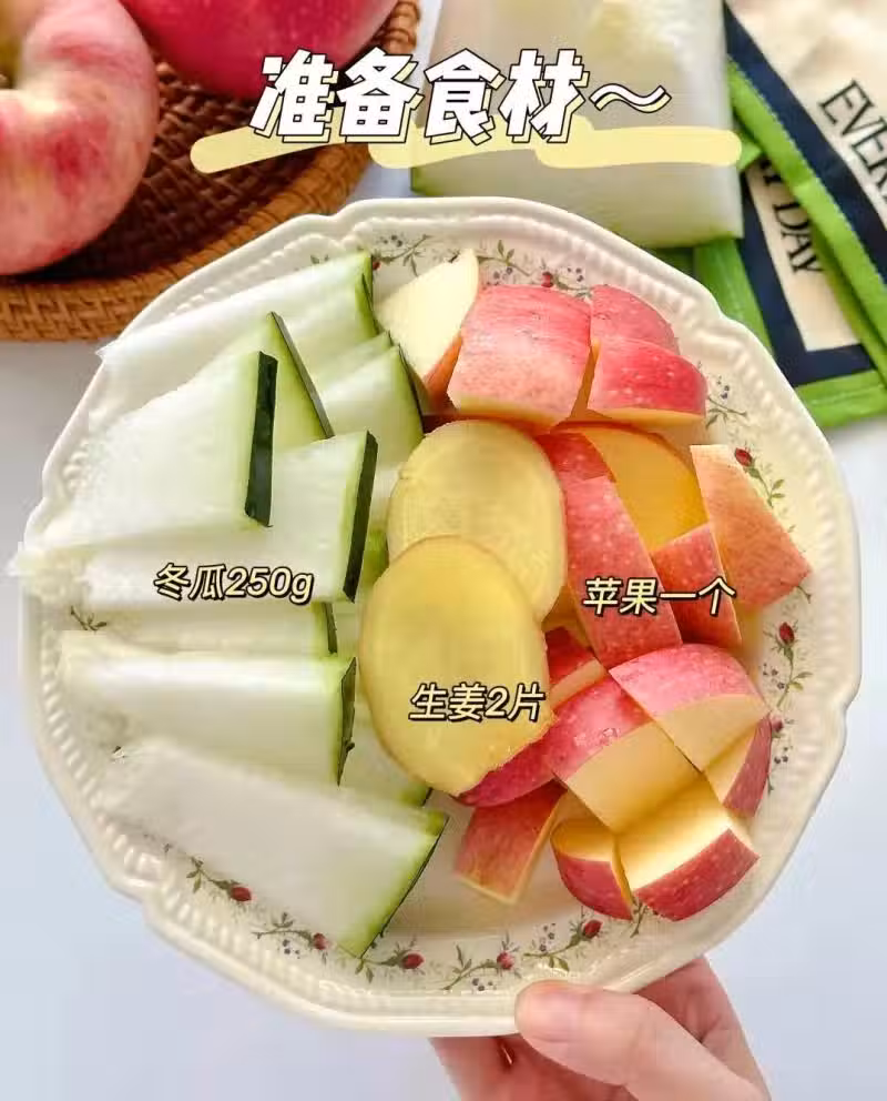1️⃣、把冬瓜、蘋果洗乾淨,再切成片兒;