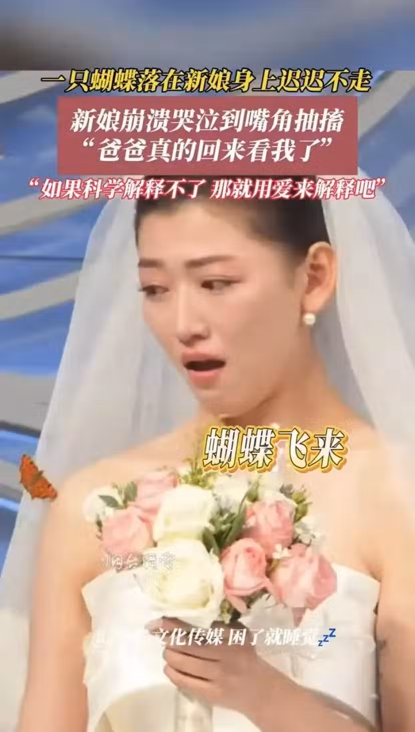 剛才還在一直笑著的新娘瞬間淚崩,嘴角不停地抽動,在這個場合她強忍著淚水,不讓自己哭出聲。不停的左右看著在自己面前飛來飛去的蝴蝶,她心理在默默的念叨著,爸爸真的來看我了,知道我今天結婚。站在一旁的新郎也是默默的看著這隻蝴蝶,不敢去驅趕,此時此刻他懂得新娘在想什麼。