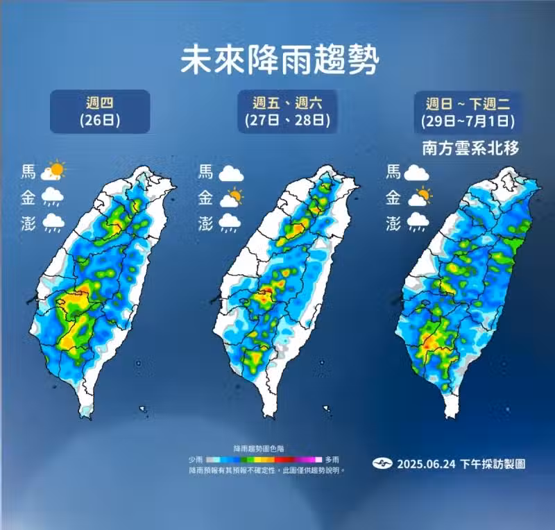 尤其下周一至周三(7月1日至3日),南部、東南部仍須提防局部大雨,氣象局呼籲民眾留意即時預報,慎防短延時強降雨與突發天氣變化。