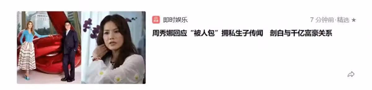 6月27日據港媒報道,日前周秀娜參加訪談節目《女人方言》,直面其入行以來持續發酵的"被包養"傳聞。面對主持人的提問,周秀娜首次公開回應持續八年的豪門緋聞。