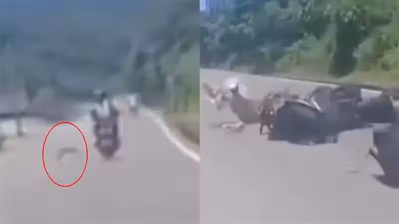 4腳撞2輪!屏東昨(26)日上午11時許,屏200線32.677公里處發生車禍,但肇事方「不是人類」而是潑猴;當時年僅19歲的陳姓男子騎機車往滿州方向行駛,途中竄出2隻猴子衝過馬路,第一隻驚險閃過,第二隻卻不偏不倚撞上前輪被輾過死亡,重心不穩機車噴飛,陳男和張姓乘客摔車滾數圈,全身多處擦挫傷,甚至手臂整塊肉被削掉,緊急送往南門醫院治療。畫面曝光,掀起網友熱議:原來這才是真正的中猴、山道猴子巧遇彼此。