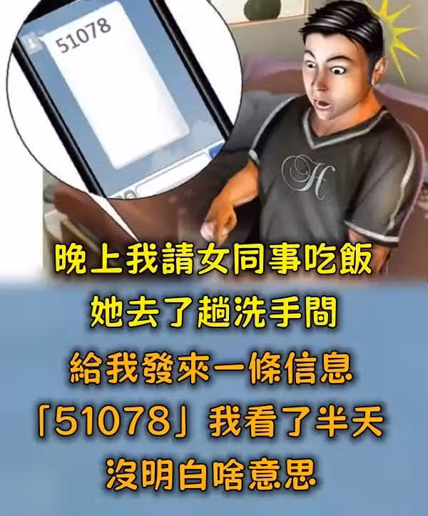 晚上我請女同事吃飯,她去了趟衛生間,給我發來一條信息,「51078」,我看了半天,沒明白啥意思。