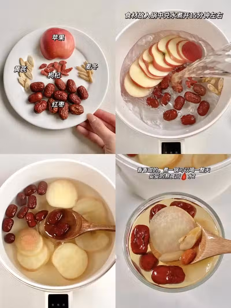 蘋果1個、黃芪10克、紅棗12顆、枸杞10粒、麥冬6顆