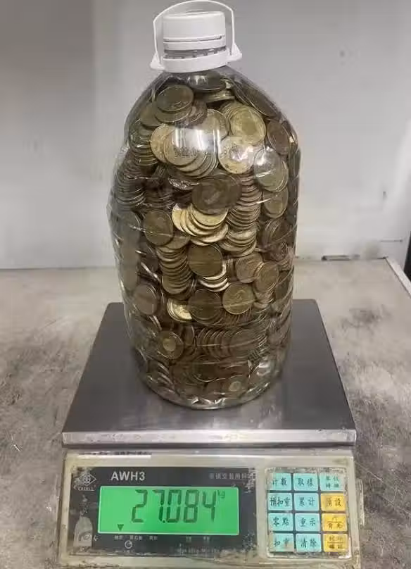 經過測量,每一桶大約重27公斤,4桶零錢就大概是108公斤。