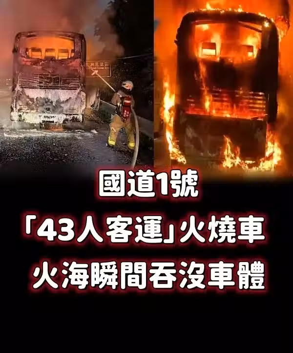 快訊/國道1號「43人客運」火燒車 火海瞬間吞沒車體...!!!