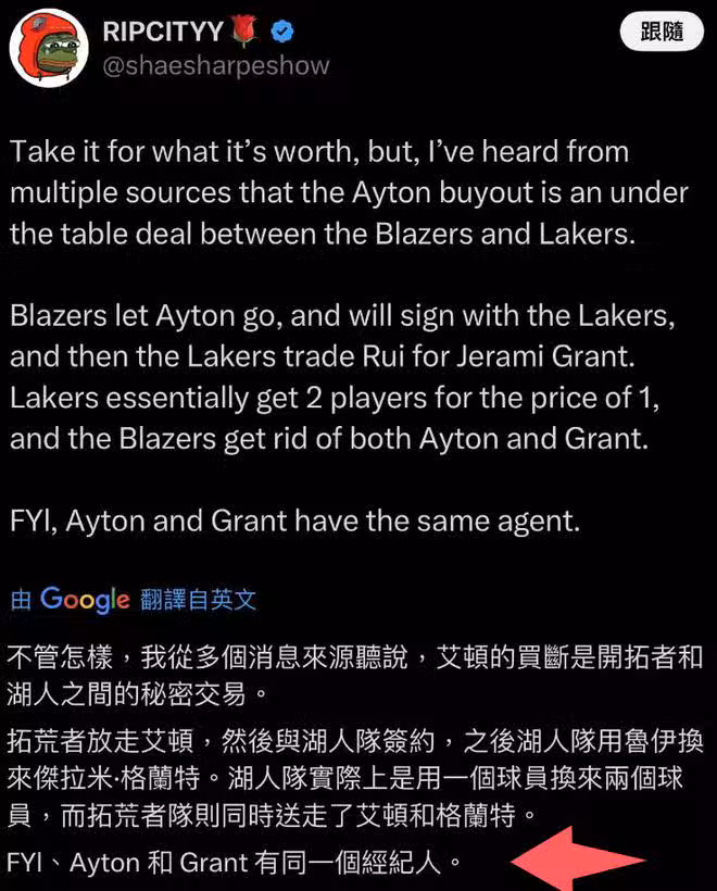 此外,RapCity還爆出了另外一個料,艾頓和格蘭特擁有同一位經紀人比爾達菲。這個重磅爆料的出現可以說意味著湖人的五巨頭陣容要來了,東契奇、里夫斯、詹姆斯、格蘭特和艾頓,這套陣容真的是無敵了。
