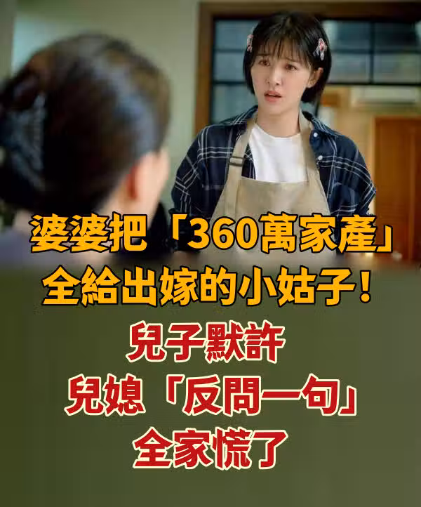 婆婆把「360萬家產」全給出嫁小姑子! 兒子默許 兒媳「反問一句」全家慌了 導語:我們都知道會哭的孩子有糖吃,因為只有你不斷的索求才會讓別人知道你的需求和渴望,一直默不作聲的孩子會給人一種什麼都不缺的印象,所以得到的關注也會少很多。