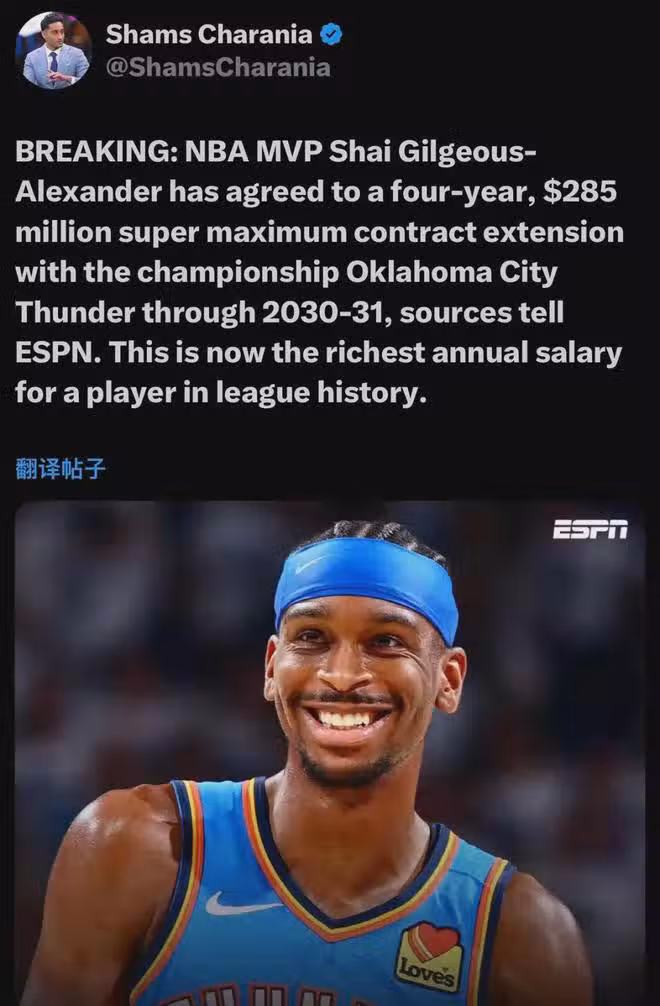 亞歷山大與雷霆達成4年2.85億美元超級頂薪提前續約合同,均薪7125萬美元,30-31賽季年薪高達7877萬美元,就此超越塔圖姆(5年3.15億美元,最高年薪7145萬美元)成為NBA史上年薪最高的球員。